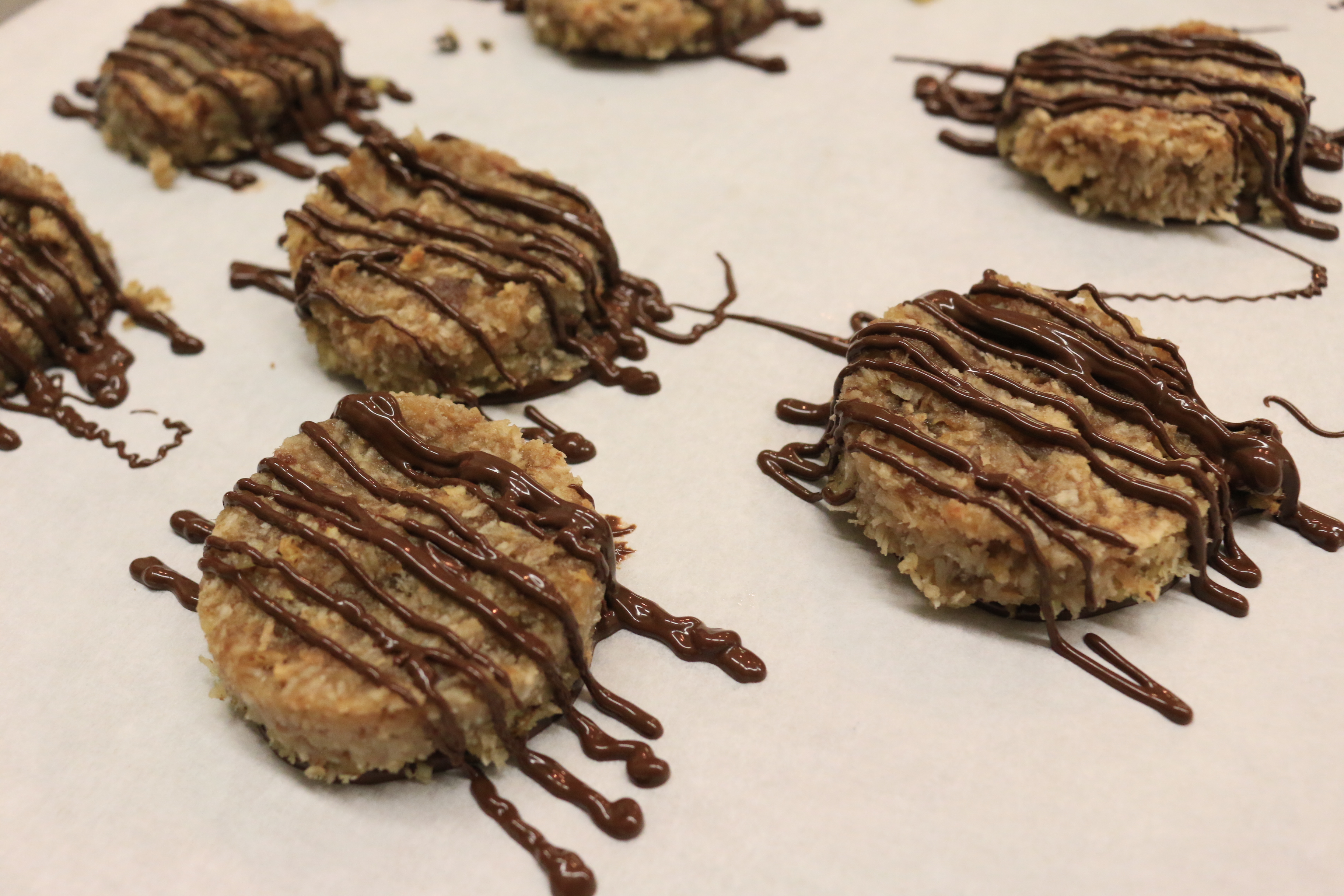 A tray of finished paleo samoa cookies topped with chocolate drizzle.
