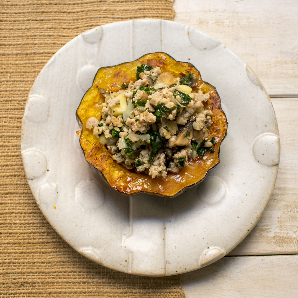 Twice Baked Acorn Squash with Chicken Sausage and Kale (AIP)