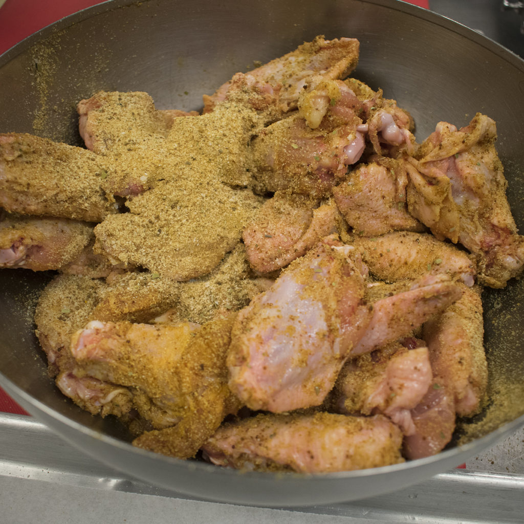 Toss the wings with some olive oil then sprinkle liberally with the rub, preheat oven to 400. Spread wings out on a greased baking tray and bake in oven for 25 minutes or until golden brown and crispy. They should register a minimum of 165 internal temperature.